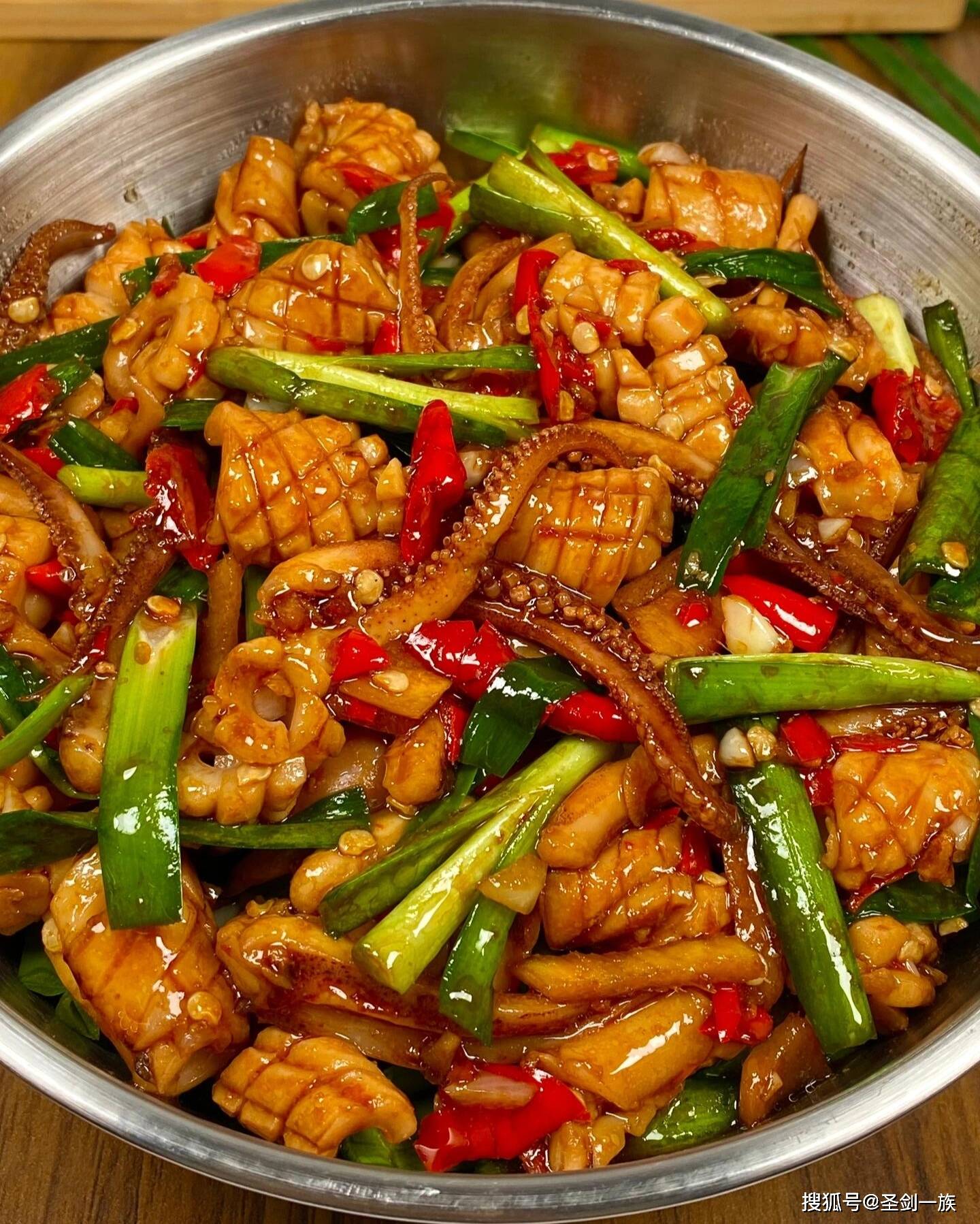 3. 加入鱿鱼和青红椒,快速翻炒2-3分钟。鱿鱼变卷曲即可。