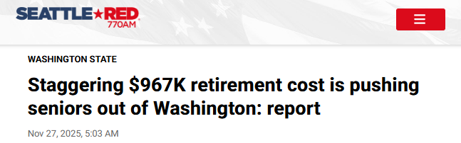 这样的环境迫使老年人必须积攒近100万美元才能保障舒适的退休生活,这让依靠固定收入的人群难以负担在华盛顿州生活的成本,不仅可能导致经验丰富的居民外流,也会动摇经济稳定性。