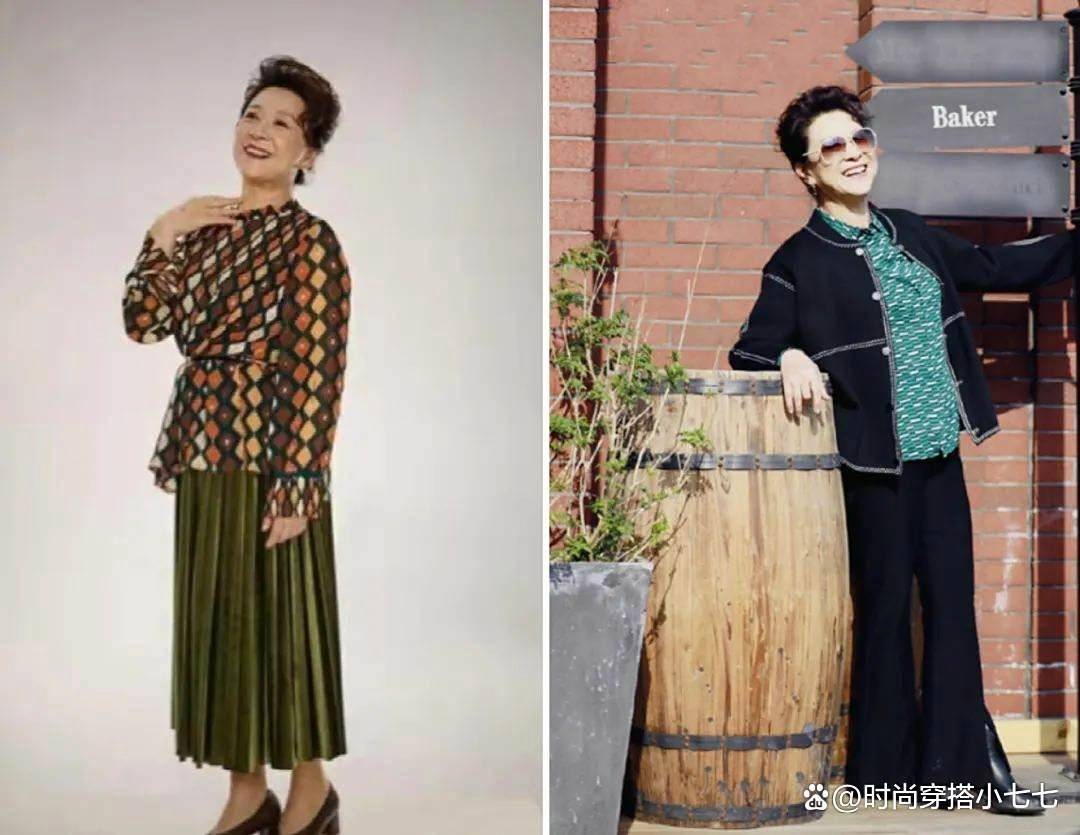穿花衣服不显老的秘诀,减少花衣服出现的面积,用纯色系去压一压,也就是我们常说的“繁简结合”原理。
