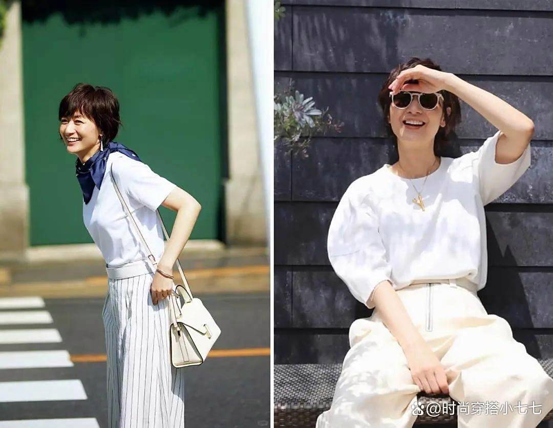 比如就夏季而言,简单的白色T恤,天丝类的阔腿裤,棕色半裙等,只要面料和质感恰到好处,穿起来也更容易模糊年龄。