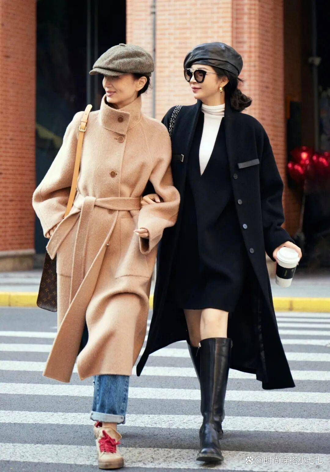 你看她们上面穿的驼色大衣,就很利落。三木在里面配了一件毛衣和小脚裤,踩一双黑色的长筒靴,超级利落。