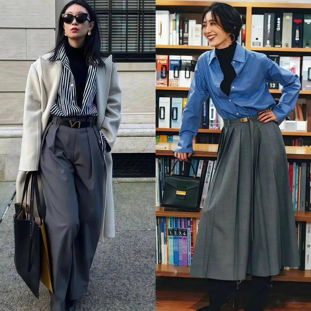 下半身你可以选择一条灰色的半身裙或者是灰色的西装裤,让你的造型轻松 get 到轻熟风的气质,变得通勤时髦。