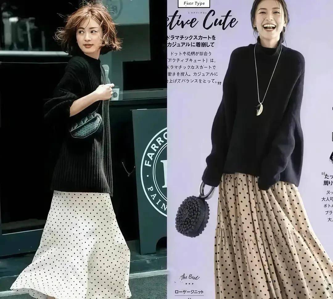 想让自己的造型比较有女人味,又有点甜美风的气质,可以选择白色的波点半身裙或者是杏色的波点半身裙,来搭配上黑色的针织毛衣,这样的穿搭还能遮肉显瘦。伞状款式的半身裙对于腿粗胯宽有小肚腩的女性非常友好。