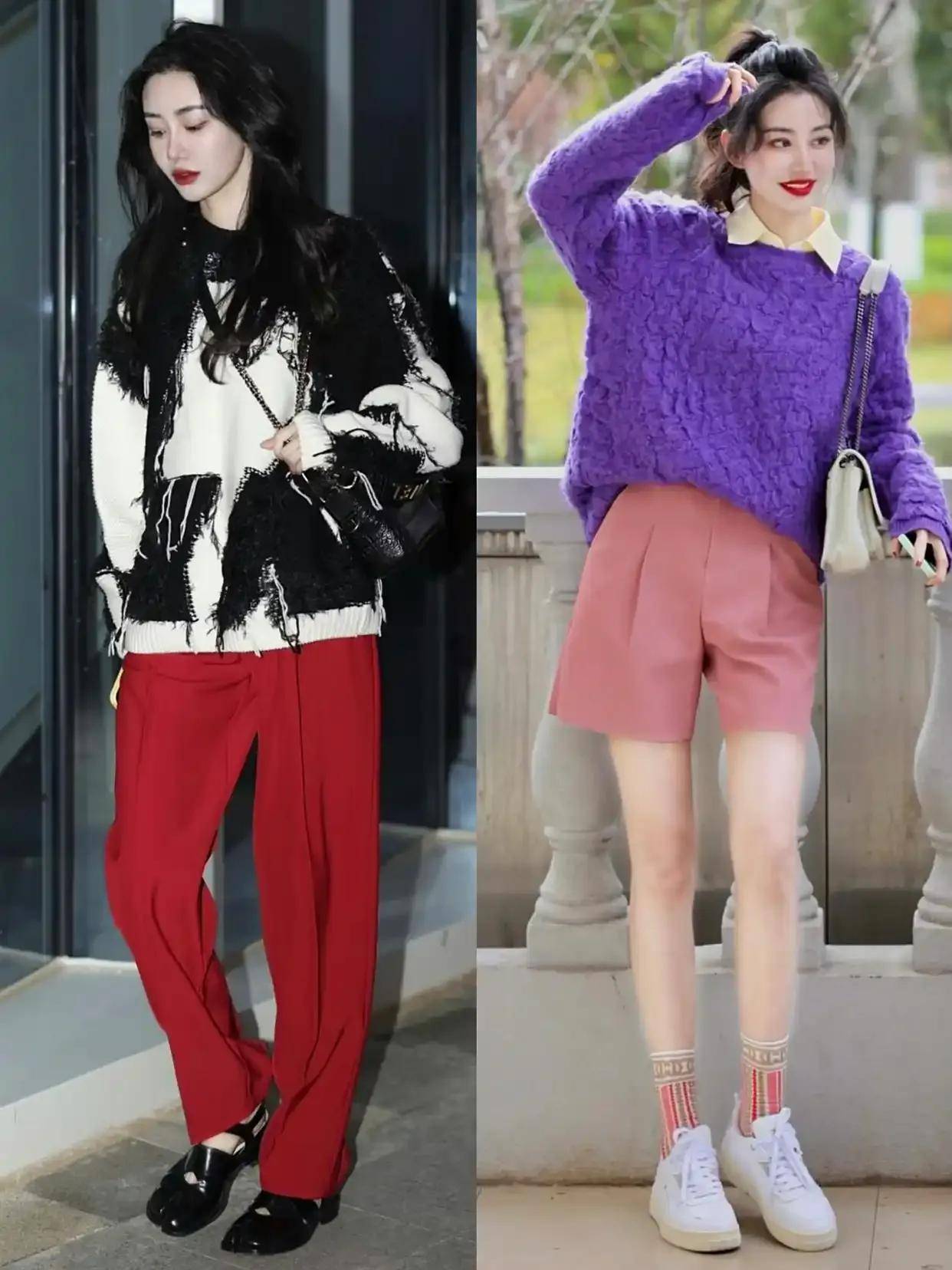 咱们看上面图片中的左边这一套穿搭色彩够张扬吧,红色的裤子搭配上白色和黑色拼接色的毛衣,脚上穿的是黑色的皮鞋。虽然颜色搭配很张扬,但整体造型配色没有超过三色调,而且黑白红组合是非常经典的配色。