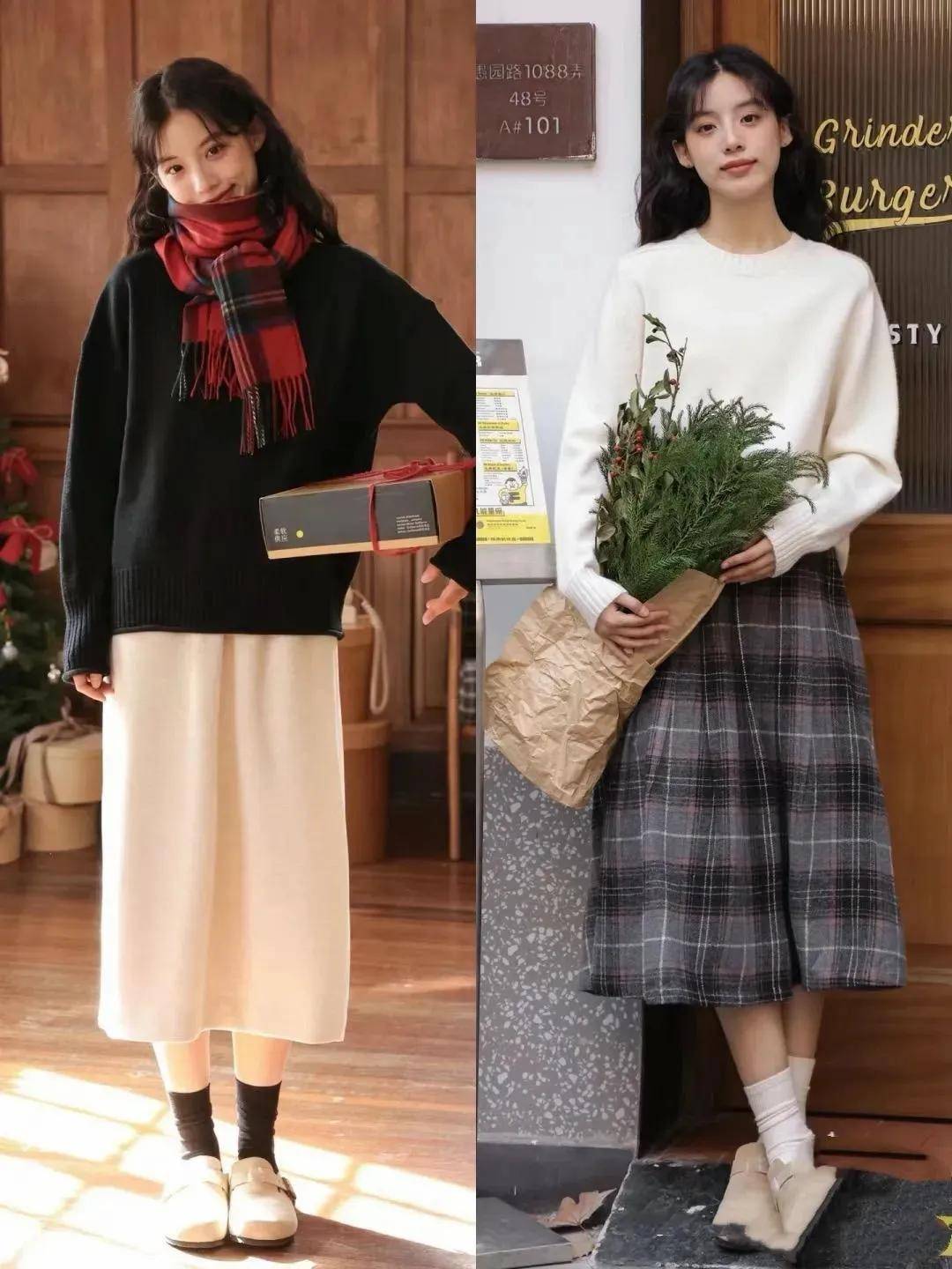 好比上面用的就是黑色的毛衣,搭配伞状款式的半身裙,就能轻松 get 到女性的温柔感,而且得体又大方。