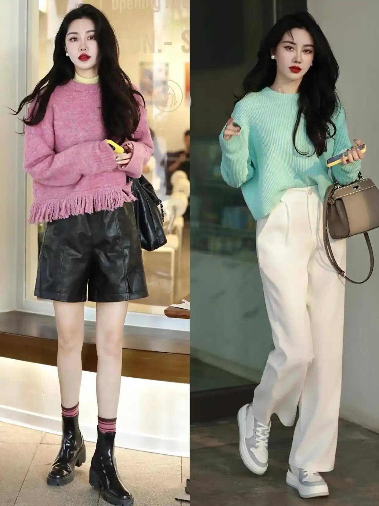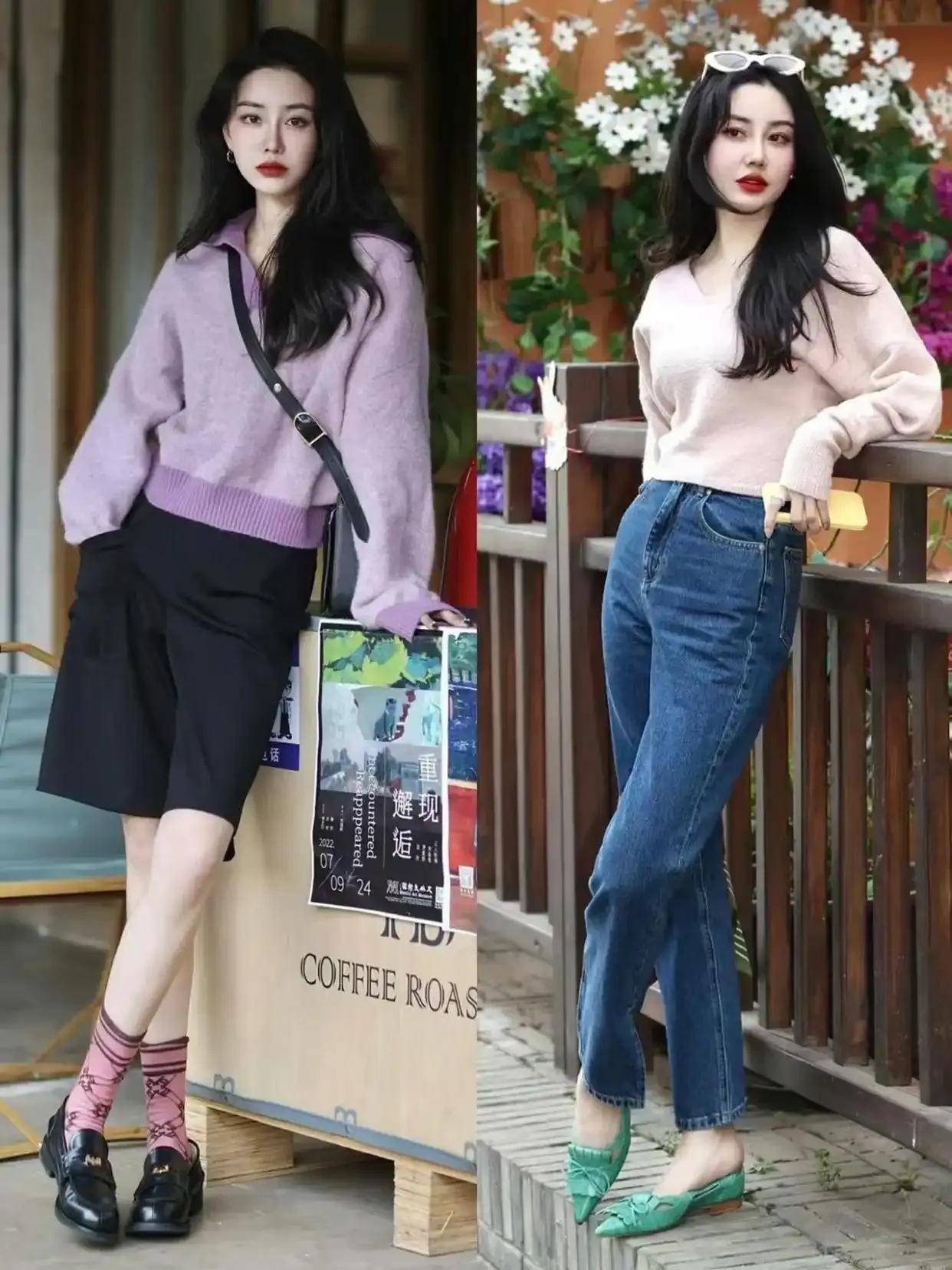年轻貌美的你当然可以尝试彩色系的毛衣,不过颜色也尽量是浅色系,例如上面浅绿色的毛衣搭配牛仔阔腿裤,脚上穿着一双皮鞋,这样的穿搭拍出来的照片就很出片。