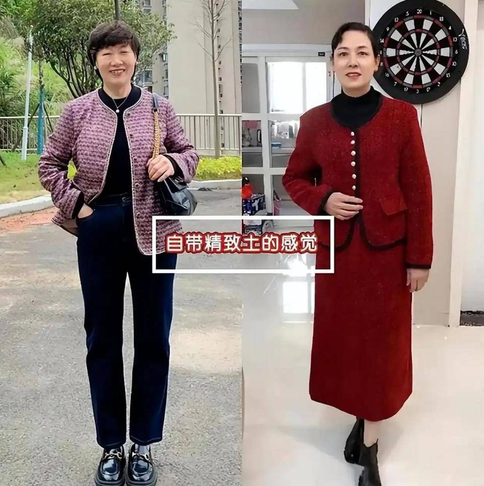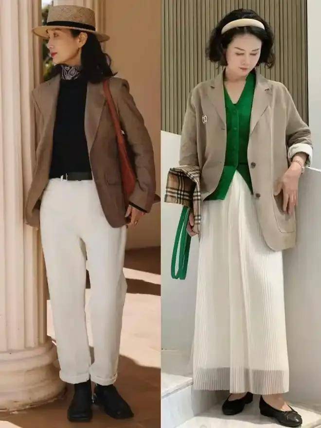 同样是 60 岁,同样是中国大妈,但是会穿的人就是完全不一样,气质可能还远高于法国奶奶。例如,上面“三木妈妈”选择了一件挺阔有型的西装外套,内搭灰色针织毛衣,加上灰色的半身裙,这样的搭配优雅大方。