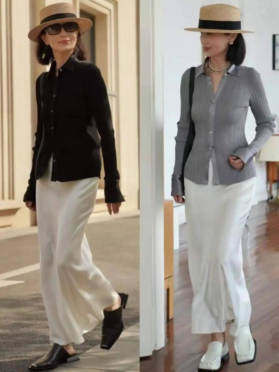 那么你也可以直接选择一件修身的灰色针织开衫,搭配上白色缎绸面料的半身裙就好,穿白色乐福鞋,头戴草帽,这样的一身穿衣打扮显贵又大气,得体大方。