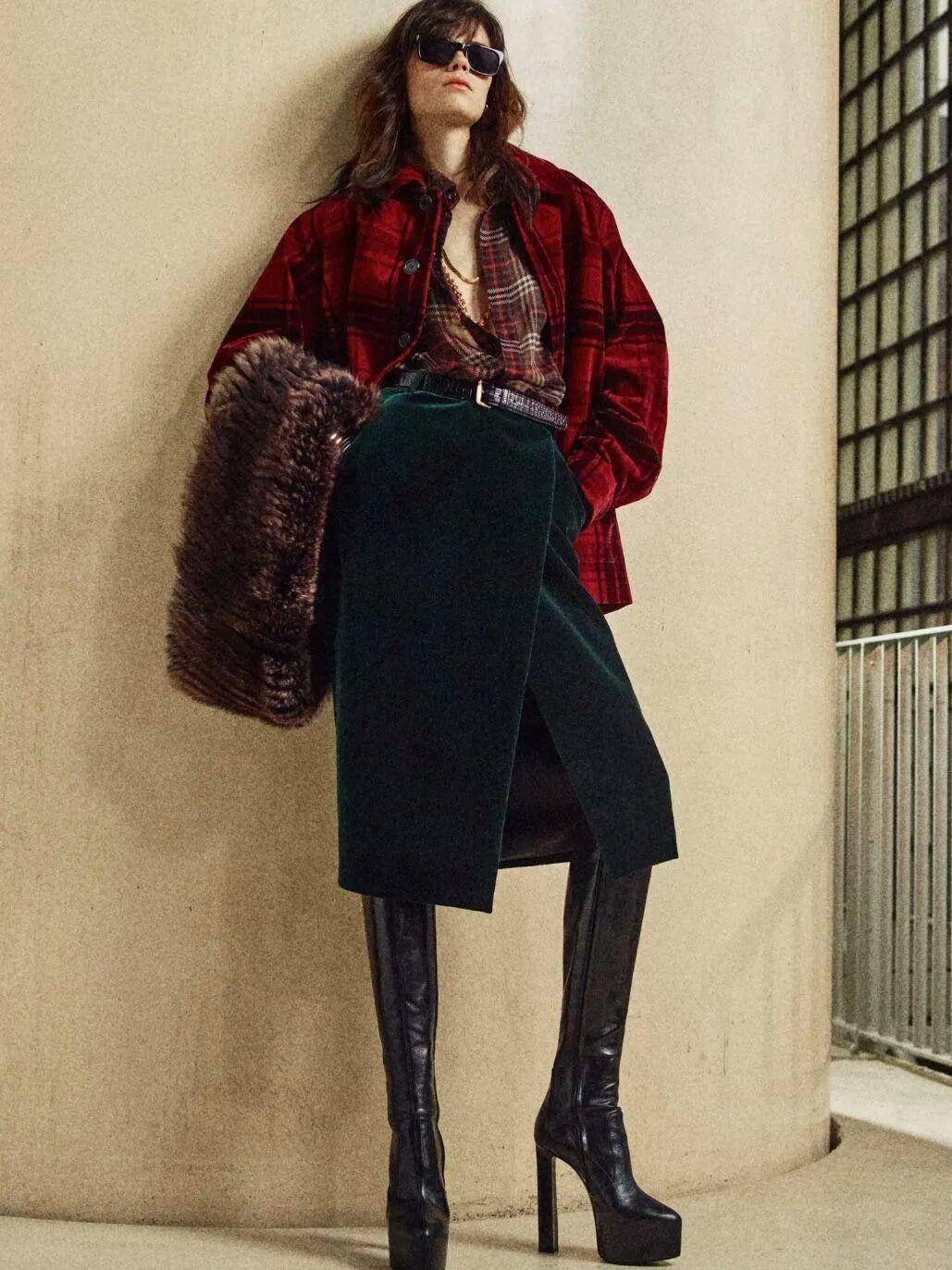 格纹衬衫搭大衣,只需遵循内繁外简的原则,就能轻松拿捏时髦感:外套选黑白灰、驼色等极简基础色,让格纹的复古韵味成为视觉焦点。