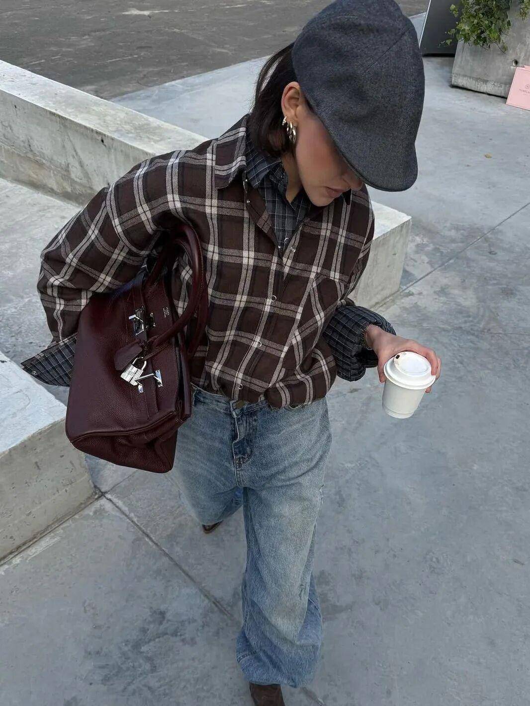 更进阶的穿法,是格纹衬衫与格纹大衣的同元素组合,不同纹路、深浅的格纹相互碰撞,成了当下时尚圈最热门的搭配思路,复古又高级。