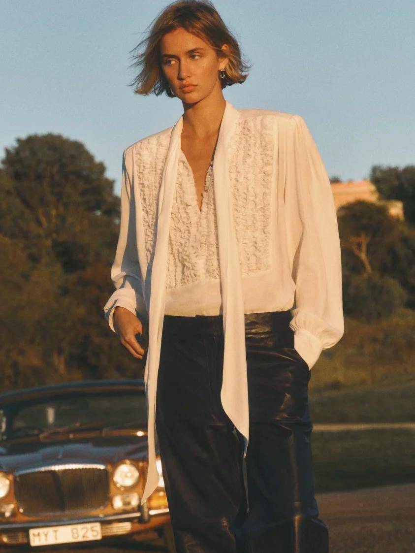 作为大衣内搭,飘带衬衫的包容感堪称一绝,无论是毛呢大衣还是皮质外套,都能搭出刚柔并济的层次感,自然垂落的飘带在领口、胸前轻轻摇曳,让冬日的厚重穿搭多了几分轻盈的想象。