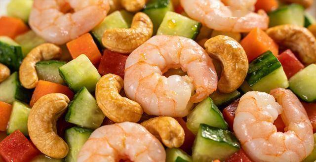 食材:虾仁 300g、腰果 100g、黄瓜 1 根、胡萝卜半根、生姜 3 片、料酒 1 勺、淀粉 2 勺、盐适量、白胡椒粉少许、食用油