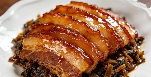 五花肉冷水下锅,加姜片、葱段、料酒煮 20 分钟,捞出沥干,用老抽涂抹均匀,晾干。锅中倒油烧至七成热,放入五花肉炸至表面金黄,捞出放入冷水中浸泡 10 分钟,方便切片。梅菜泡软洗净,切碎,锅中倒油炒香梅菜,加入生抽、盐调味,盛出备用。五花肉切成薄片,皮朝下码在碗中,铺上梅菜,加入冰糖、八角、桂皮、生抽、清水。蒸锅上汽后蒸 60 分钟,取出倒扣在盘中,即可食用。小贴士:炸五花肉时要注意安全,避免油溅出;蒸的时间越长,肉质越软烂入味。