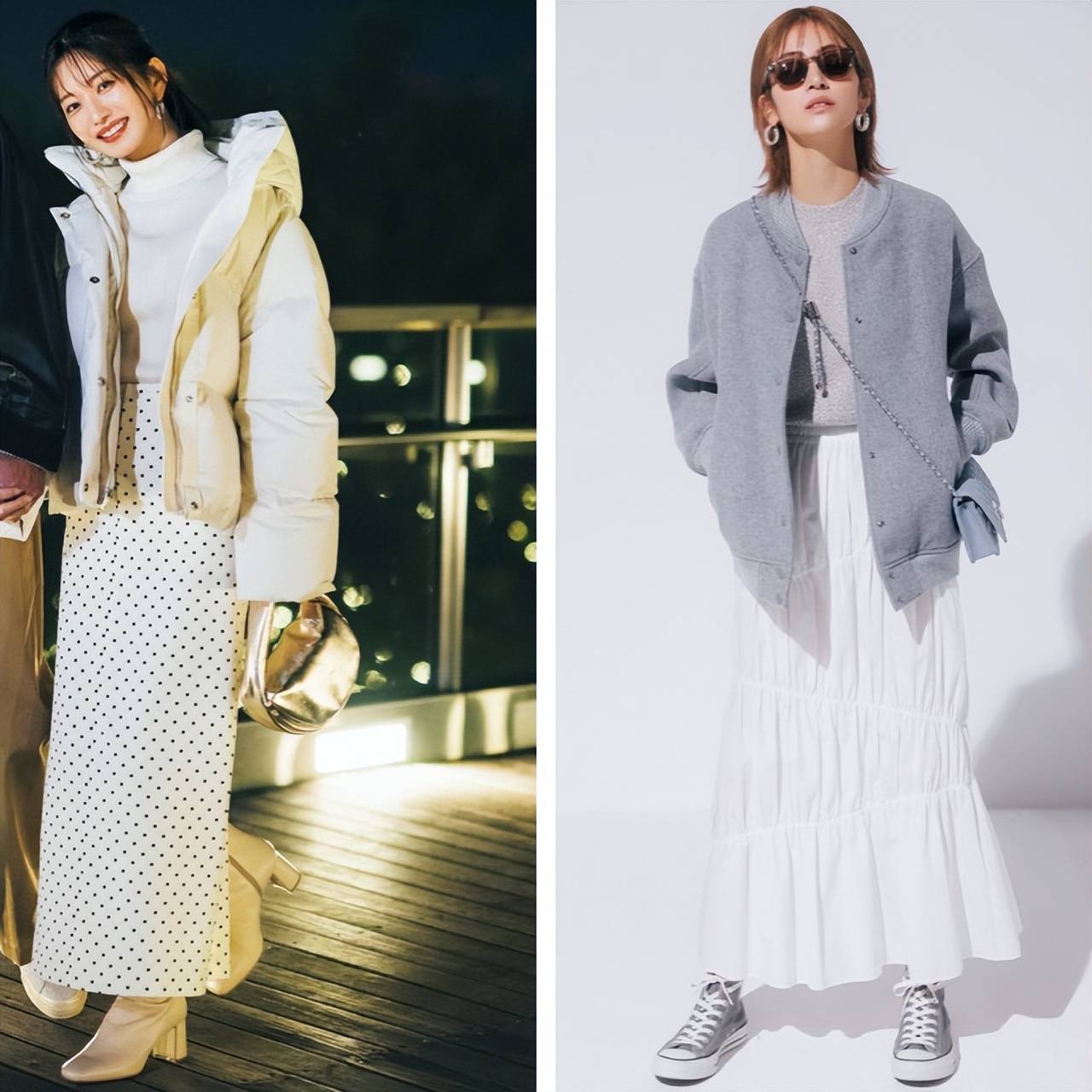 反光板效果让白色瞬间点亮表情,是冬季约会的得力助手。搭配复古可爱的波点裙与女孩风的简约白色羽绒服,平衡甜度。用白色针织衫、羽绒服、麂皮靴的材质感制造层次感,时尚感也会随之提升。