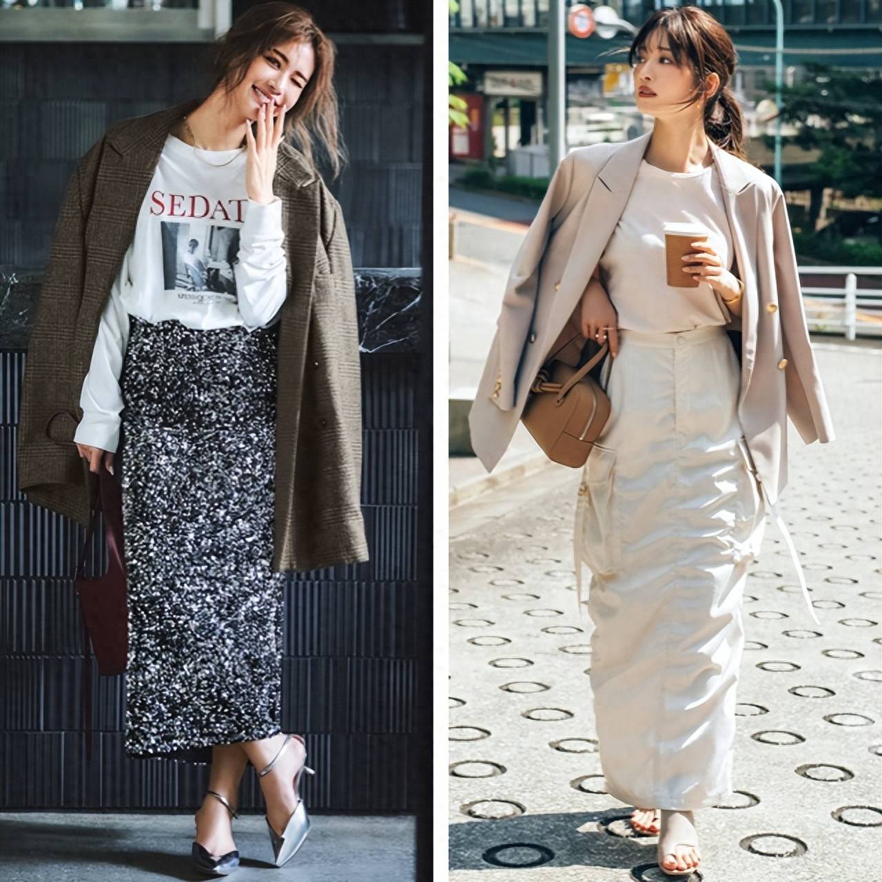 用灰色西装搭配浅黄色半身裙,打造出既不张扬又充满活力的色彩搭配。值得一提的是,这款适合职场的美人鱼半身裙,臀部至大腿处不会过于紧绷,裙摆的蓬松度也恰到好处。