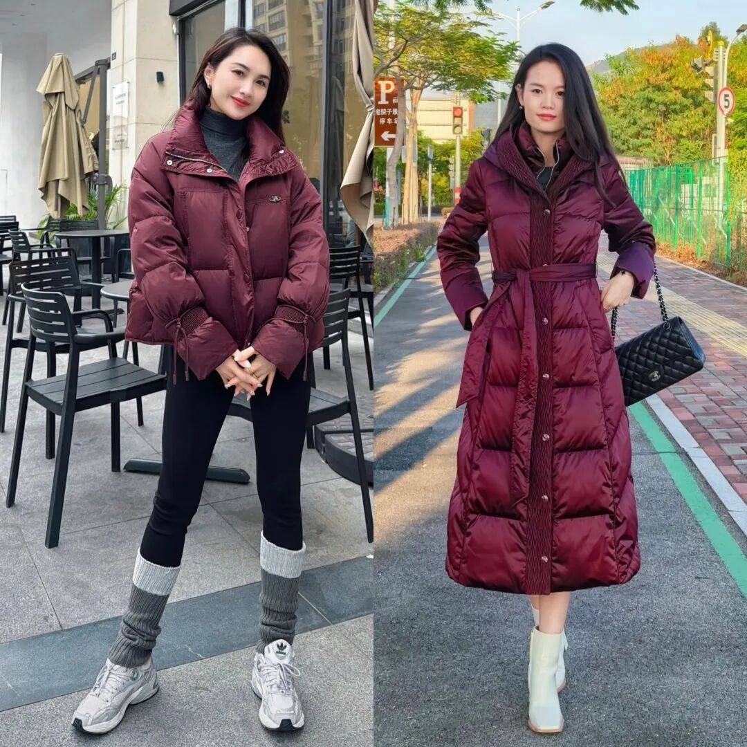 比如说,你可以穿件短款的酒红羽绒服,配上同色系高领毛衣,下身配条深灰色的直筒半裙,温柔显知性。