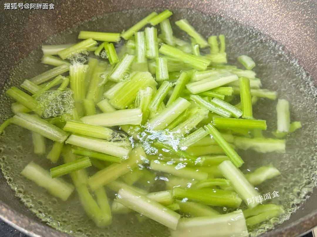 4、再准备一点芹菜切细丝,水开放进来烫一分钟半,之后捞出来过凉水。