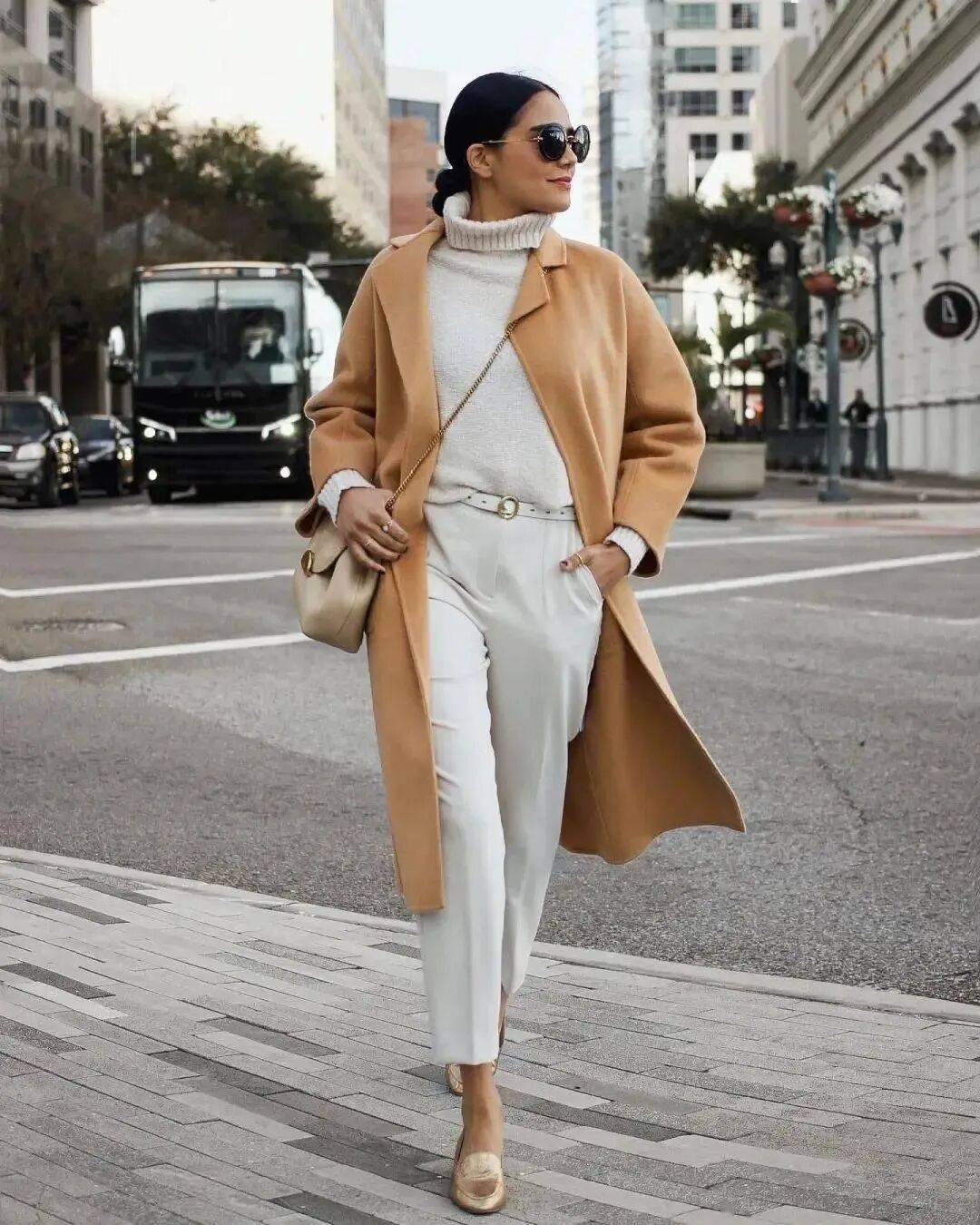 大衣搭配高领毛衣是冬季的经典搭配,兼顾了保暖和质感。