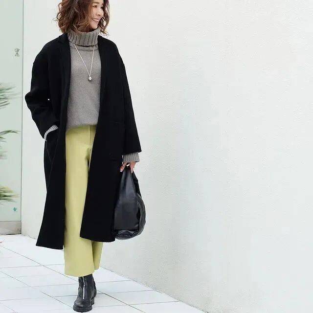 像这件,黑色大衣配灰色高领毛衣。增加了颜色的层次。