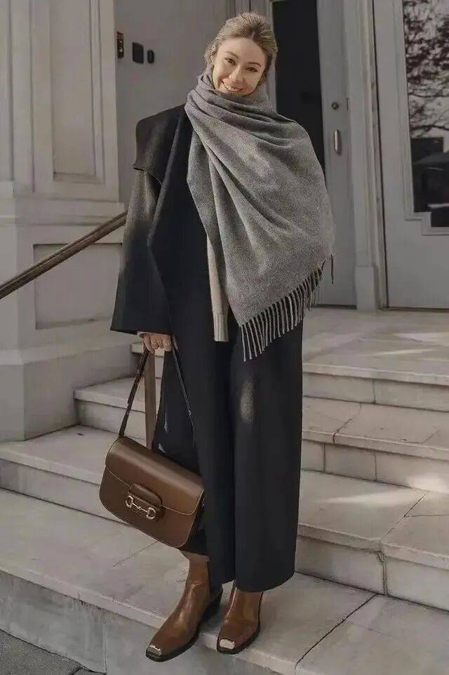 这件黑色大衣,配一条灰色针织围巾,风格更优雅和知性。