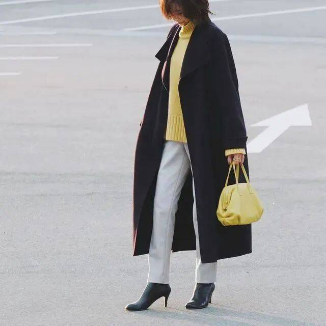 高领毛衣无缝衔接脖颈的线条,和大衣流畅的廓形结合,形成纵向延伸感,非常显高挑。如果想穿出那种休闲舒适感的氛围,建议选领口宽松的毛衣。