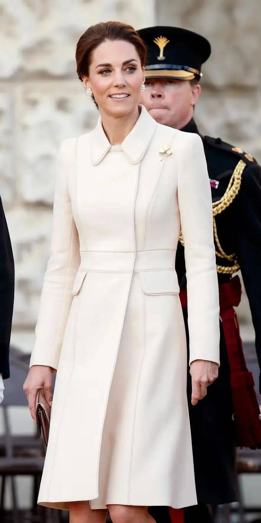 这是一件白色的大衣,内搭浅驼色的高领毛衫,露出白色的衬衫领。是非常经典高级而且富有层次感的三层叠穿,有清爽温柔和知性的气质,非常适合通勤约会,能展现好品味。
