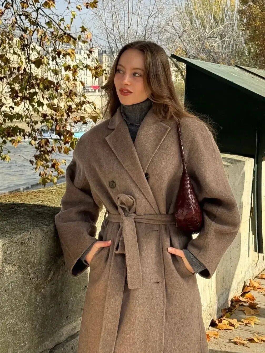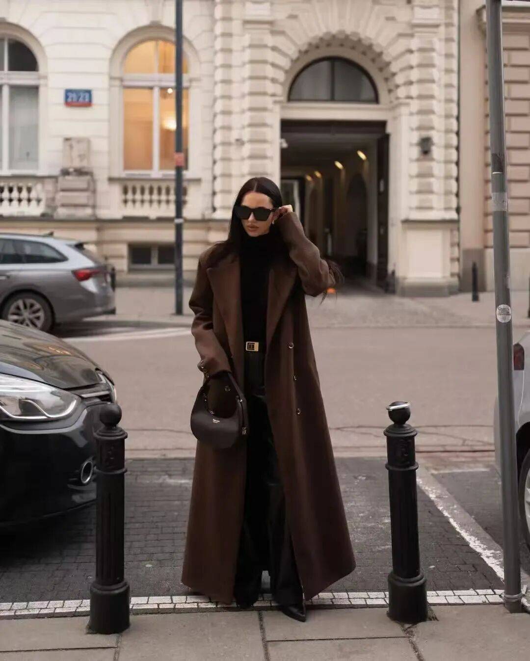 而这件深咖色大衣,内搭的是黑色的高领毛衣,既有冬日的温暖氛围,又有故事感。这套穿搭高级大气,有质感。