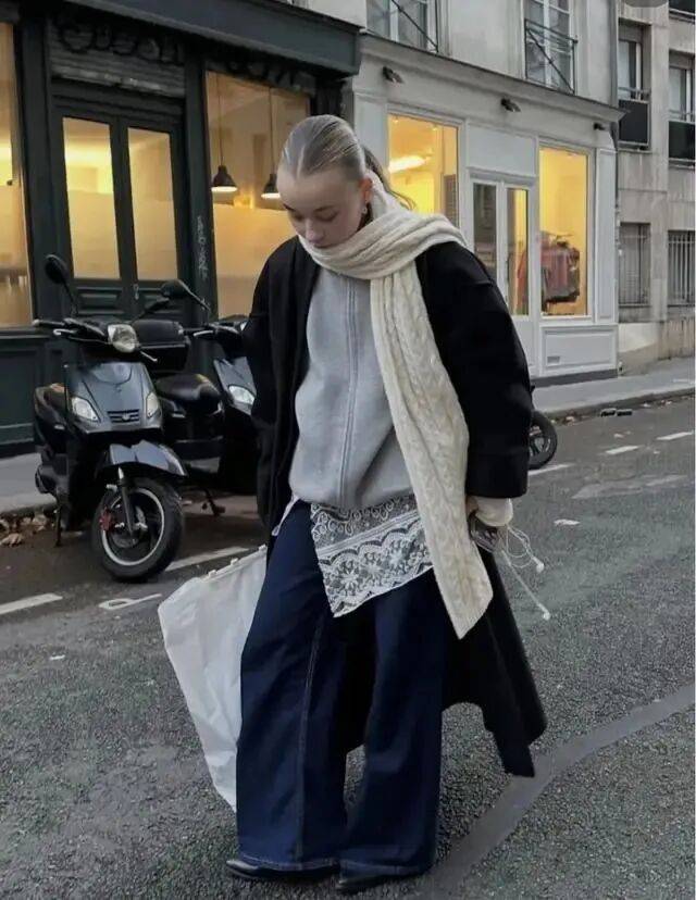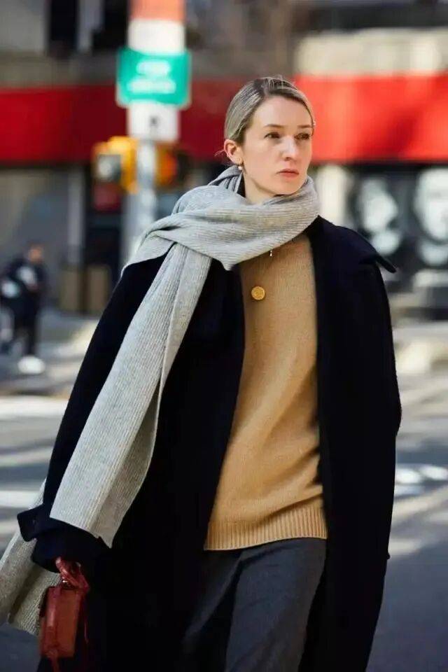 这件大衣配灰色羊毛围巾,打造了慵懒和高级感,更时髦。