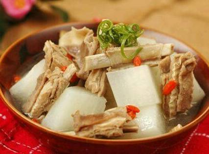 2、将排骨炖至肉脱骨,再加入萝卜,葱炖熟