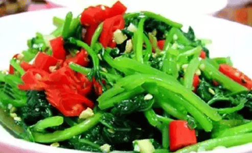 2.锅里加油烧热下辣椒炒香再下蒜末,最后倒入红薯苗翻炒,调味,出锅.红薯苗的嫩叶子口感很好,有点软糯的感觉。