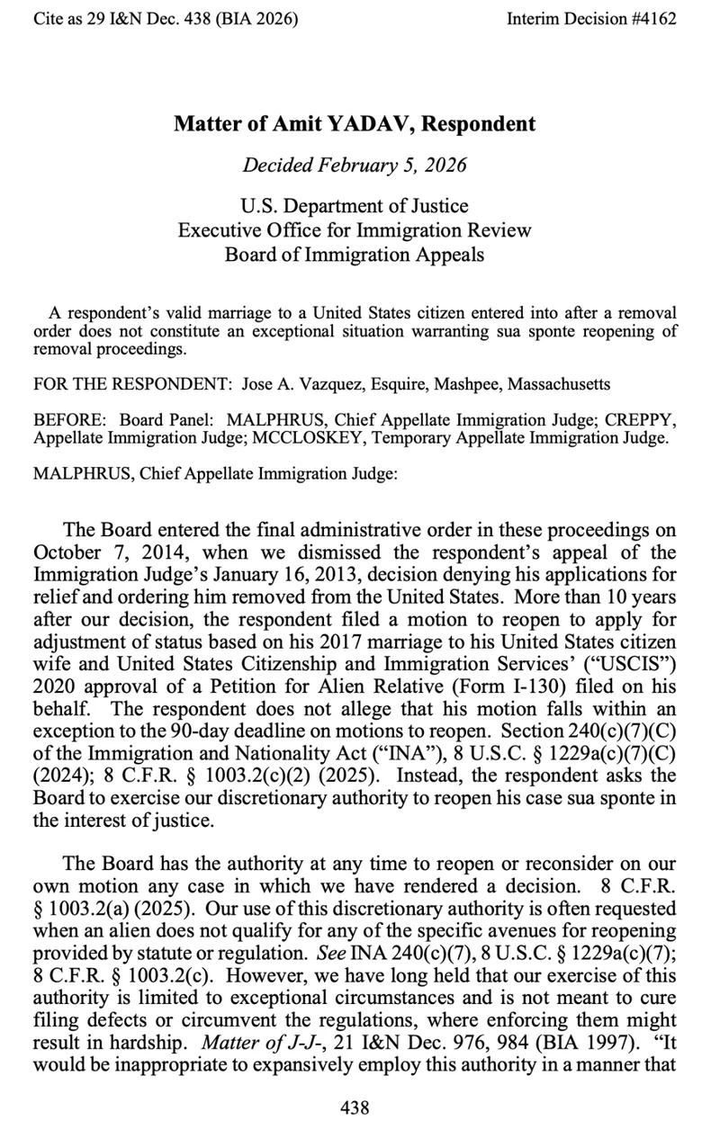 2月5日,美国移民上诉委员会发布一项震动移民法律界的重要判例——Matter of Amit Yadav(29 I&N Dec. 438)。裁决明确指出:非公民在收到最终遣返令之后才与美国公民结婚,不能构成“特殊情况”,不足以促使移民法庭主动重启已终结的遣返程序。