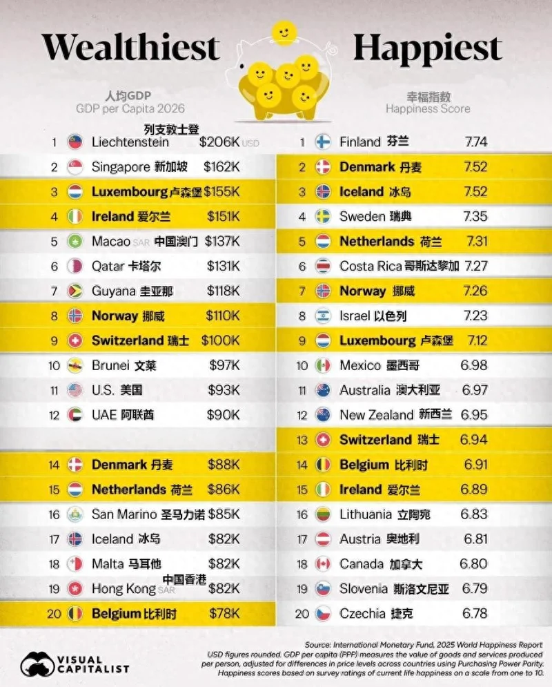 2月28日,基于国际货币基金组织(IMF)的数据,下图按人均GDP(根据购买力平价调整)对全球最富裕的国家/地区进行排名。其中,列支敦士登以超过20.6万美元的人均GDP位居榜首,其次是新加坡(16.2万美元)和卢森堡(15.5万美元)。一些规模较小但与全球联系紧密的经济体排名靠前,包括爱尔兰(15.1万美元)和中国澳门(13.7万美元)。美国排名第11位,人均GDP达9.3万美元。另一方面,根据《世界幸福报告》的数据,下图亦列出全球最幸福国家,幸福指数要求人们以0到10分来评价自己的生活。