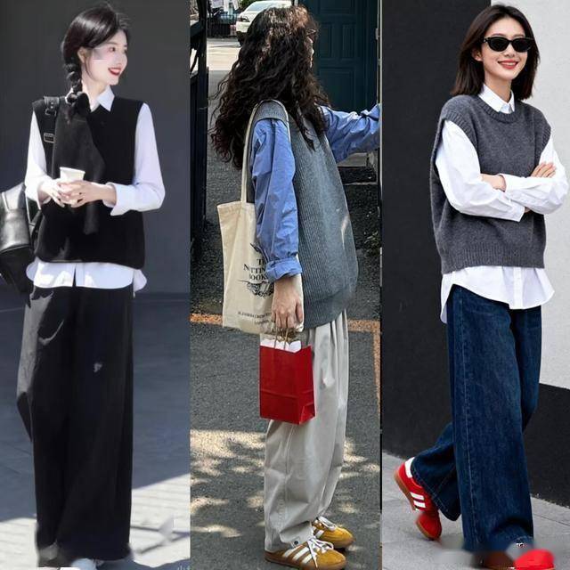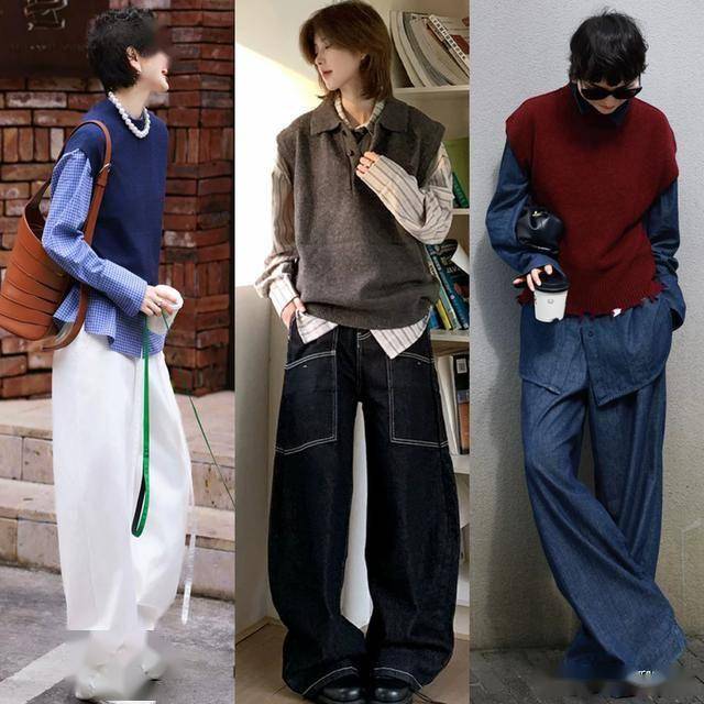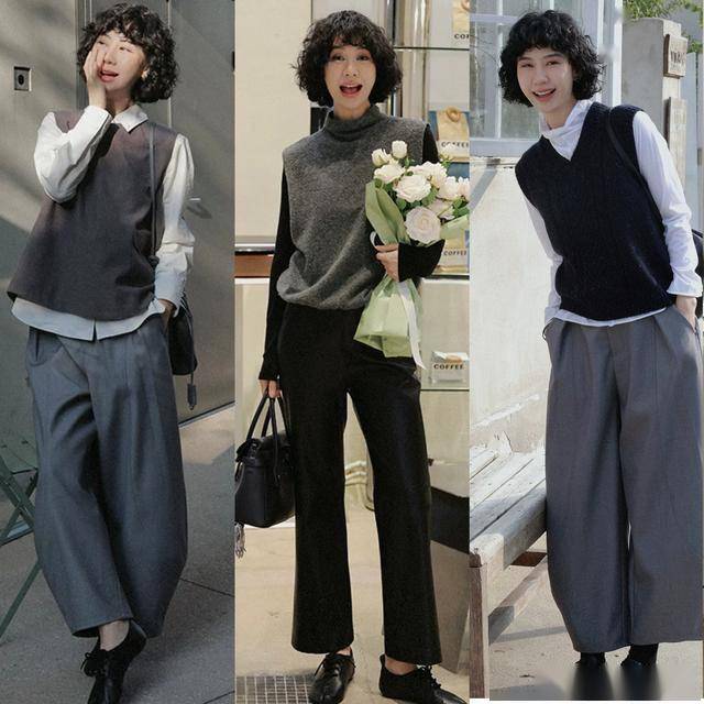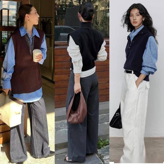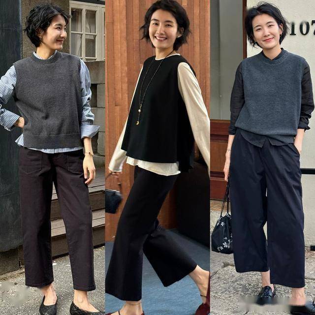 毛衣背心搭配九分阔腿裤,演绎出利落清爽感 除了长袖长衣外,今年春季也非常流行毛衣背心,它更适合叠穿,搭配不同风格的打底,可盐可甜,选择一条九分阔腿裤搭配起来,更利落干练,显高显瘦。 灰色毛衣背心叠穿黑色衬衫,简洁利落中透着知性的魅力,很适合40+的女生,配九分长度的黑色阔腿裤,露出脚踝,显得更干练清爽,加上沉稳内敛的配色,高级感十足。