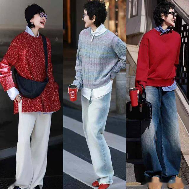 40+的成熟女生,想要在春季穿得高级又时髦,可以尝试毛衣与衬衫的叠穿,配上大气的牛仔阔腿裤,减龄效果OK,又很显贵。 番茄红色的毛衣叠穿蓝色衬衫,撞色的叠穿带着复古的腔调,搭配牛仔阔腿裤,给人一种港风的味道,减龄又帅气。
