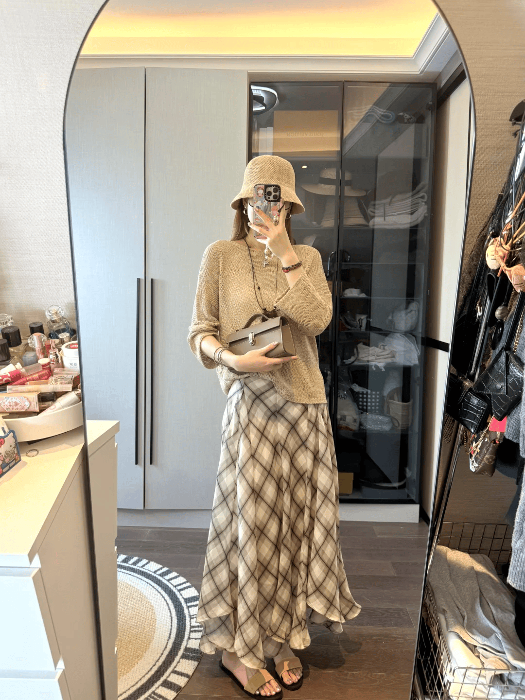 燕麦色毛衣与同色系格纹半身裙搭配时,注重深浅层次变化,比如浅燕麦毛衣配深格纹裙。轻柔面料凸显温柔感,可将毛衣半塞进裙子,凸显腰线。再搭一双白色乐福鞋,配小巧珍珠耳饰,轻松营造出春季温柔清新的氛围。