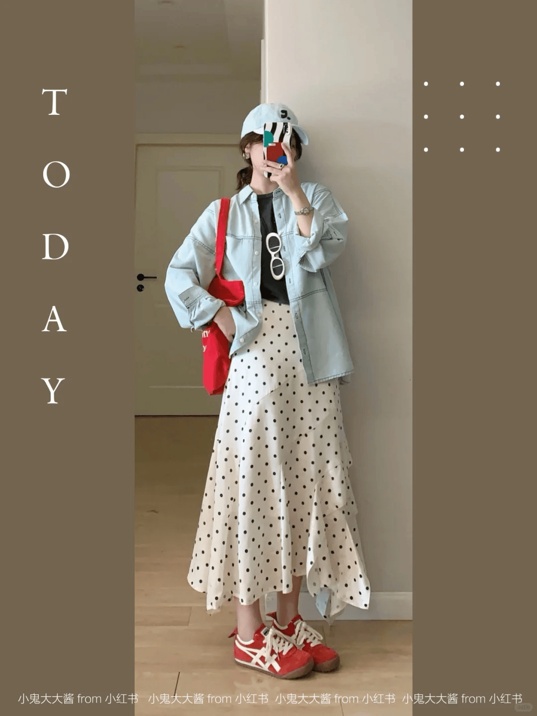 这身穿搭善用色彩碰撞与风格融合。泛白水洗牛仔衬衫自带复古感,内搭黑色T恤层次分明。白底黑波点裙优雅灵动,与上装形成经典搭配。红色德训鞋与帆布包相互呼应,打破沉闷,为整体注入活力,轻松打造出休闲又时尚的混搭造型。