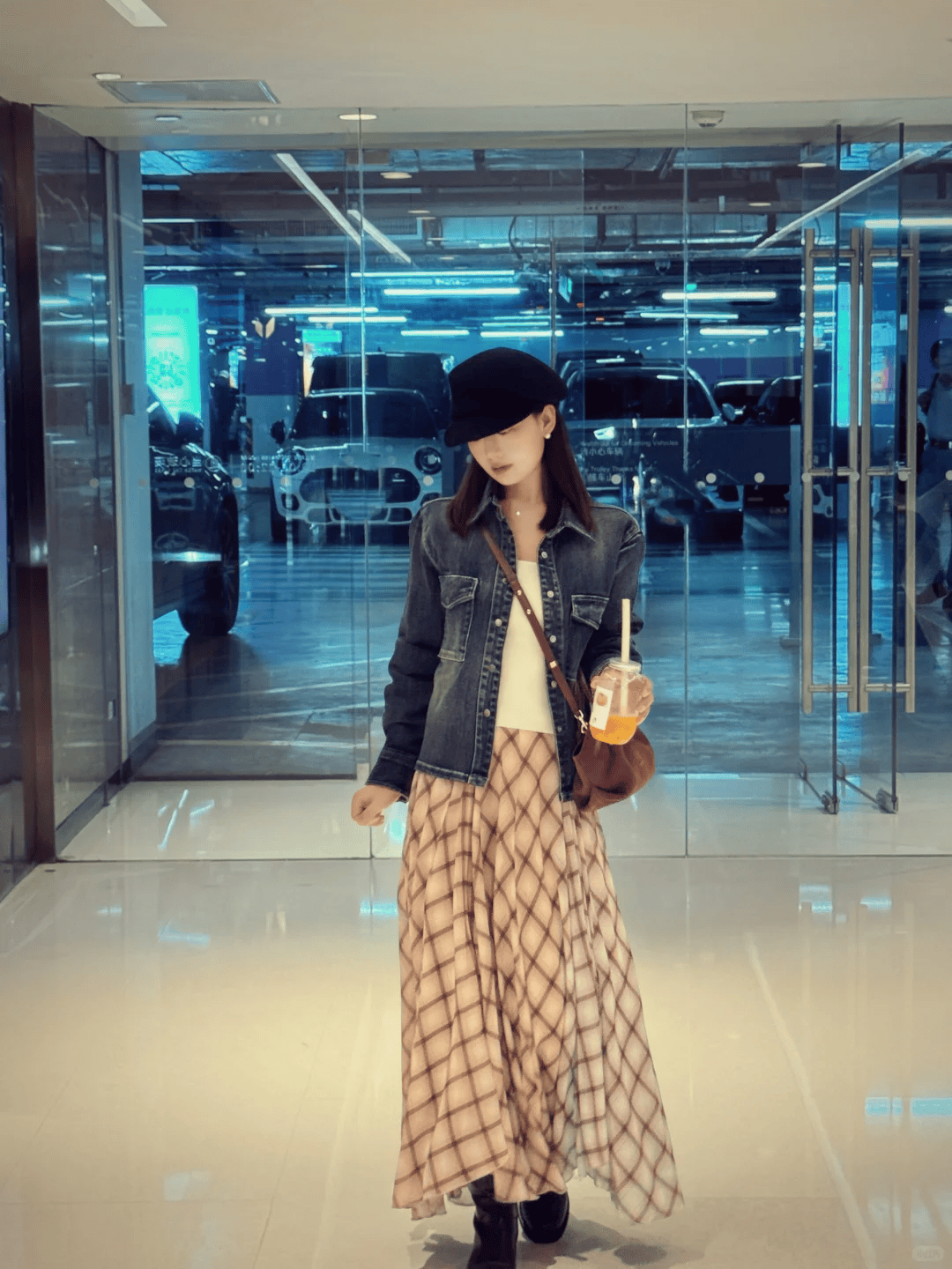 牛仔短外套利落有型,内搭白色小吊带增添清爽感。选择飘逸格纹长裙,长度至脚踝上方,走动间灵动优美。黑色马丁靴增加酷帅感,与柔美长裙形成反差。可将吊带塞进裙子里,凸显腰线,轻松打造出又甜又飒的春日街头风。