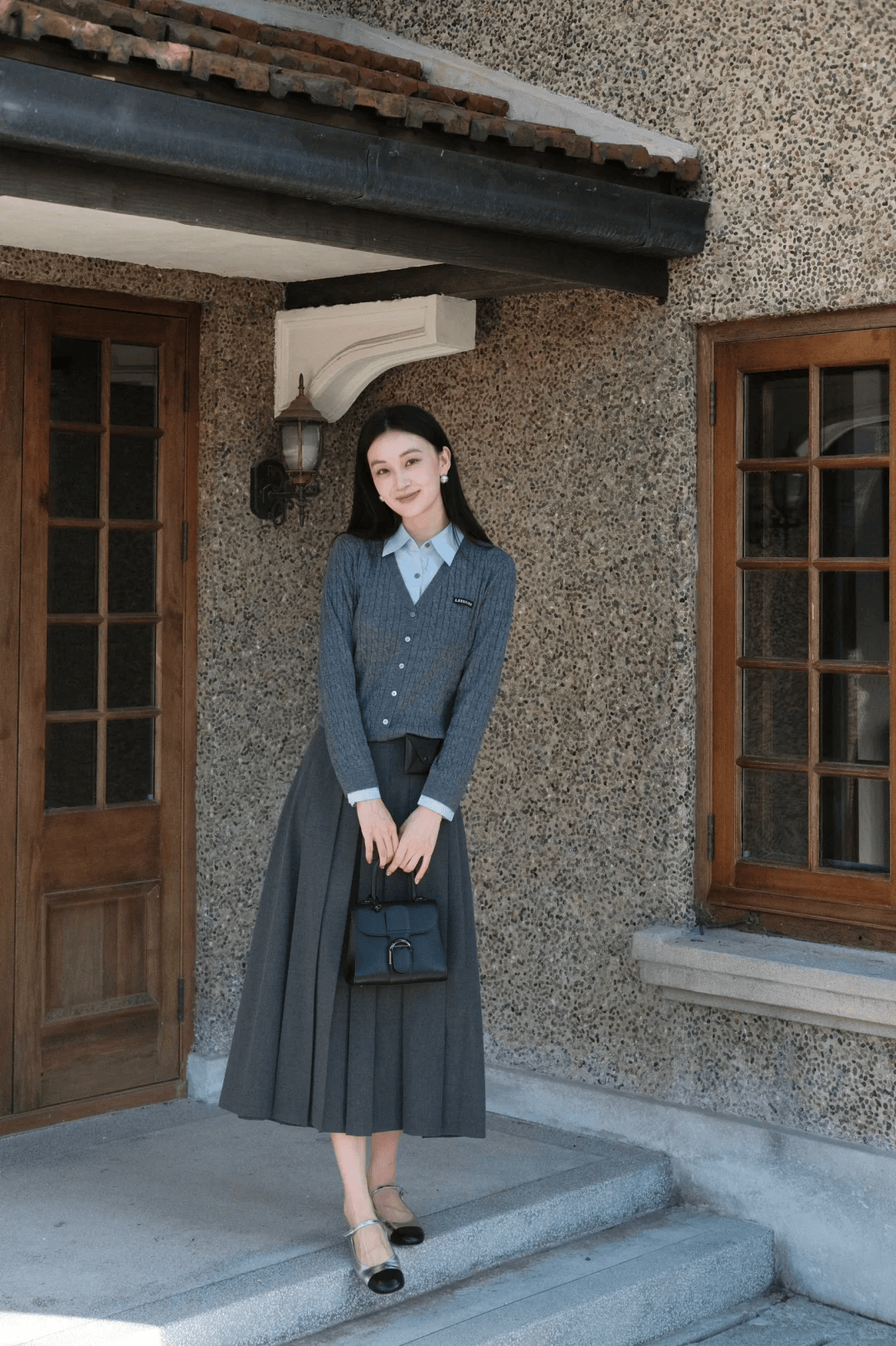 想要穿搭造型更加时髦减龄,可以尝试一下学院风穿搭,深灰色针织开衫叠穿浅蓝色衬衫,下半身选择深灰色高腰百褶裙,配一双玛丽珍鞋,就算是30+的女性也能穿出大学生的气质,可谓是简约又减龄,满满的清新感。