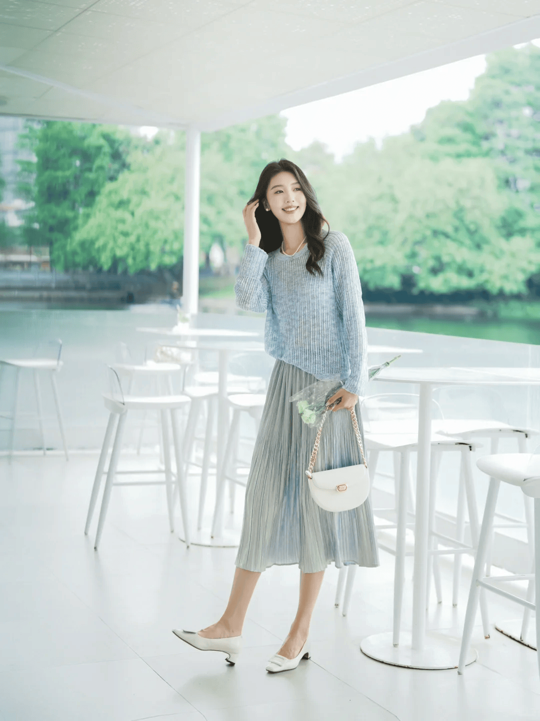 百褶裙与毛衣的组合,最适合打造春日温柔氛围感穿搭,浅蓝色的轻薄款针织毛衣,搭配同色系饱和度更低的百褶过膝裙,再踩一双米白色的浅口鞋,拎一只与鞋子同色的包,整体造型呈浅色系,春日小清新氛围直接拉满。
