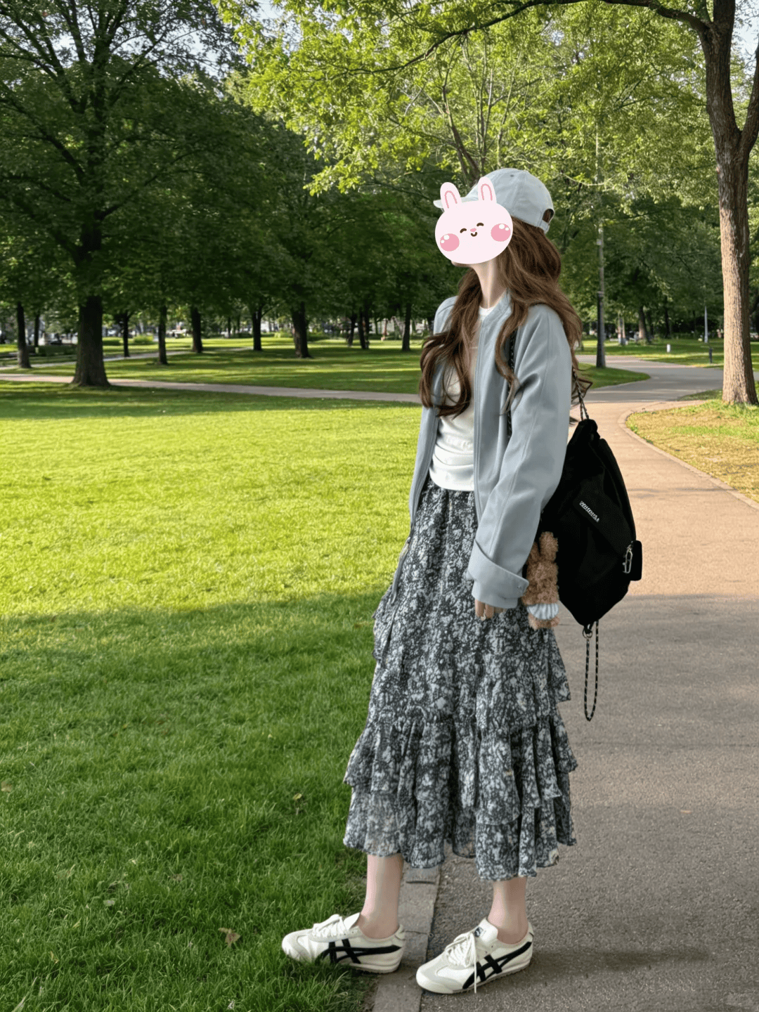 这身穿搭巧用同色系深浅搭配,灰绿短外套与深灰碎花裙层次分明又和谐。白色T恤提亮且过渡自然,德训鞋增添休闲感。黑色挎包作为点缀,打破沉闷。将T恤扎进裙子凸显高腰线,优化比例,轻松打造出休闲又精致的日常造型。