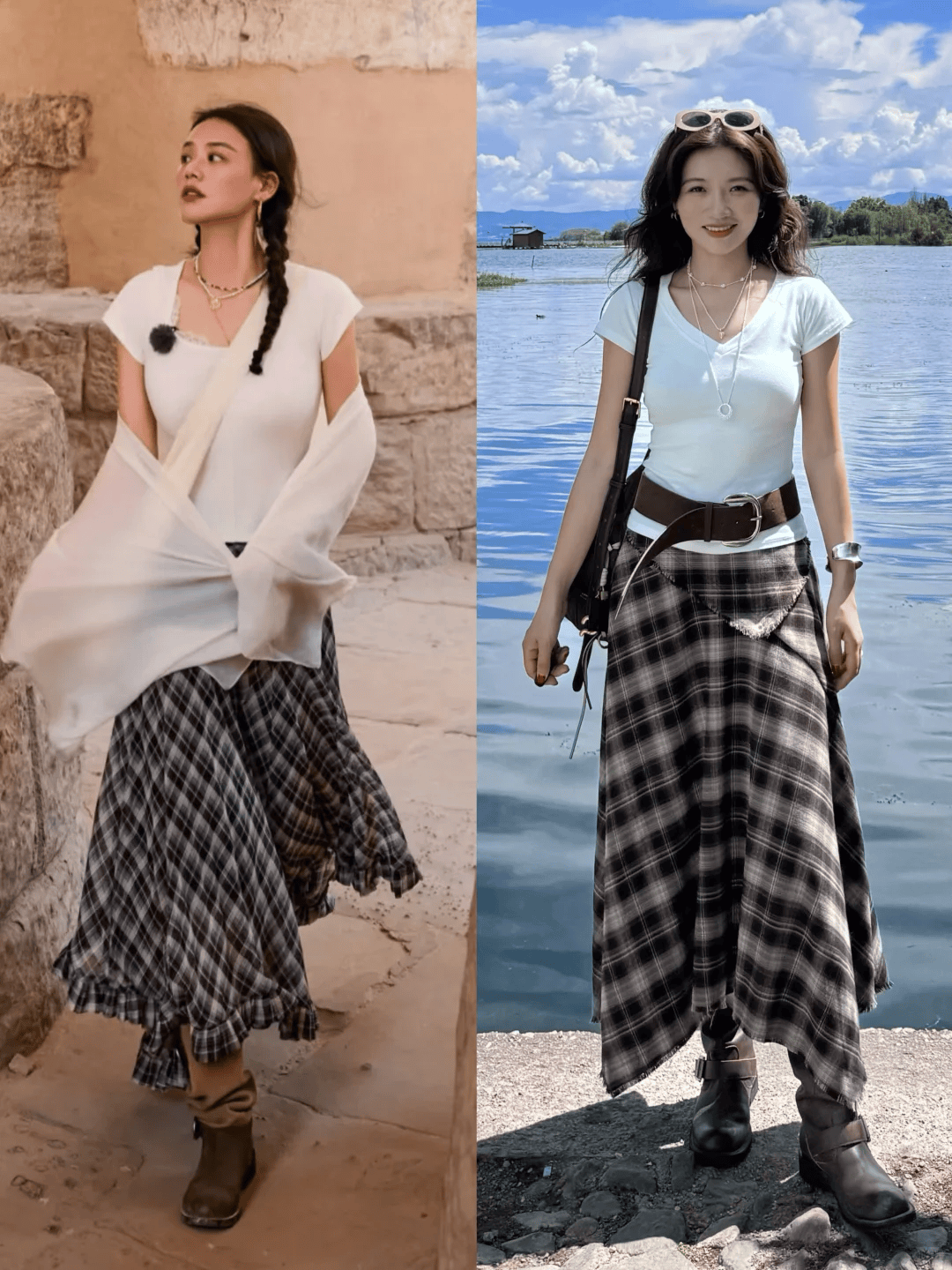 最后,想要造型时髦又个性,可以选择不规则裙摆设计的格纹过膝裙,搭配短款马丁靴,真的超级复古又帅气。