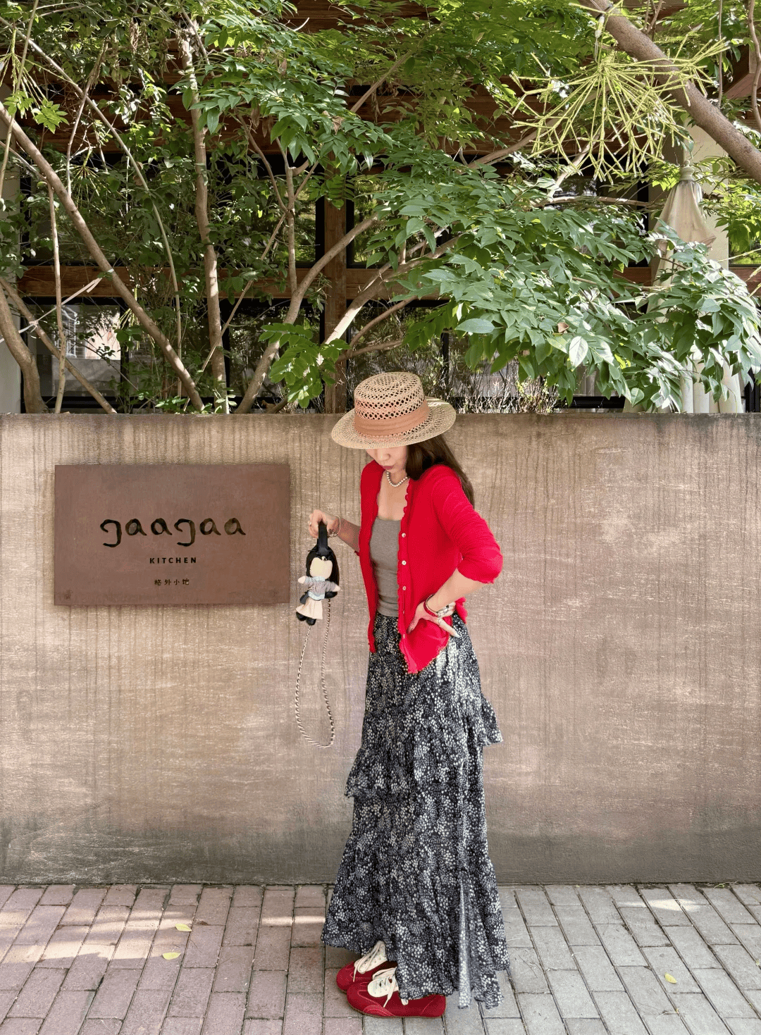 红色奶奶衫内搭灰色小吊带,修身的版型完美展示身材线条,再搭配一条黑色的小碎花半身长裙,脚蹬一双红色玛丽珍鞋,尽显优雅维尔纳。配上一个精致的黑色链条小包,简约又时尚。微风吹过,碎花裙摆轻轻摇曳,与红色奶奶衫相映成趣,走在街头,瞬间成为焦点,散发着复古又迷人的法式风情,让人移不开眼。