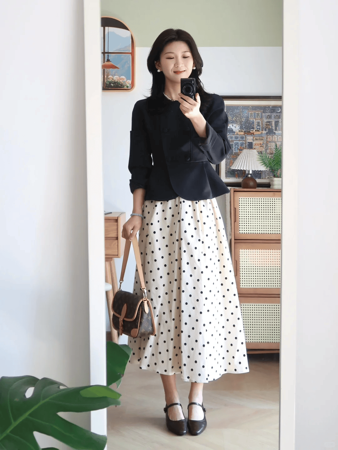 最简单的莫过于经典的黑白配,属于懒人穿搭的必备,黑色超短款收腰小西装搭配白色波点过洗澡,黑色玛丽珍鞋,上短下长的搭配,超级显身材,不用露腿,也能利用高腰线打造完美大长腿穿搭。