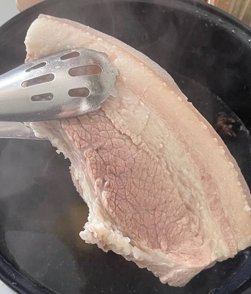 回锅肉之所以叫回锅肉,关键就在于“回锅”二字。这看似简单的两个字,却藏着让平凡食材脱胎换骨的秘诀。新鲜的五花肉,经过第一次煮制,去除了血水和杂质,肉质变得紧实又软糯。煮好的肉捞出来,放在一旁稍微晾凉,这时候的肉,就像一块未经雕琢的璞玉,等待着在厨师的手中绽放光彩。