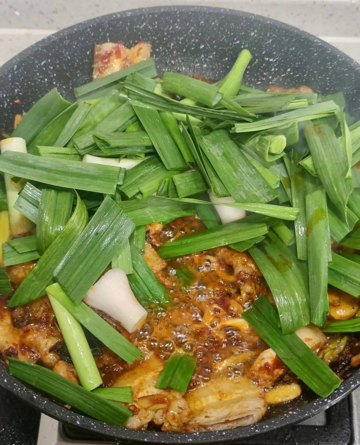 配菜也是回锅肉不可或缺的一部分。蒜苗,绝对是回锅肉的黄金搭档。翠绿的蒜苗洗净后,将蒜白和蒜叶分开切段。蒜白要斜着切,这样在炒制的时候更容易入味;蒜叶则切成小段,绿莹莹的,看着就清爽。还有那红彤彤的豆瓣酱,这可是回锅肉的灵魂所在。豆瓣酱的香味浓郁又独特,带着微微的辣味,为这道菜增添了丰富的层次感。