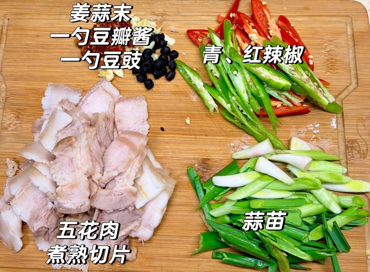 五花肉300克、蒜苗200克、青红椒各1根、豆瓣酱1勺、姜1块、葱1根、料酒1勺、生抽1勺、白糖少许、盐适量、食用油适量