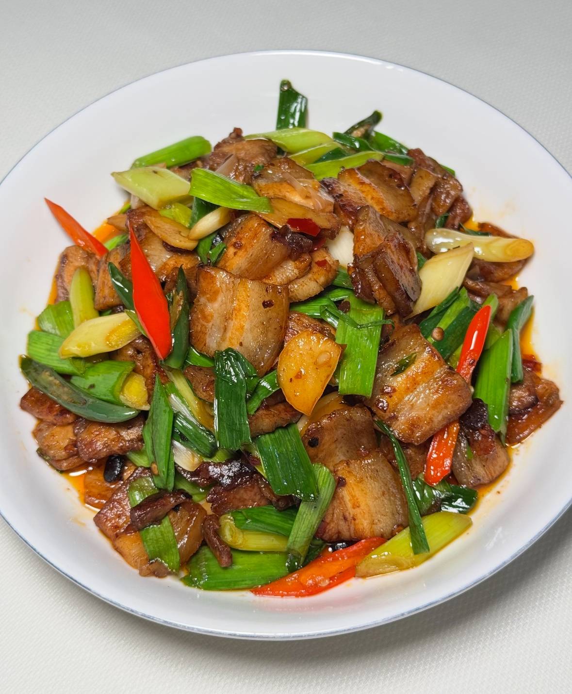 一盘色香味俱全的回锅肉就做好了。金黄的肉片、红亮的豆瓣酱、翠绿的蒜苗,搭配在一起,宛如一幅美丽的画卷。夹起一片肉放入口中,肉质鲜嫩多汁,香辣可口,蒜苗的清香在舌尖散开,让人回味无穷。再配上一碗热气腾腾的白米饭,那滋味,简直绝了。