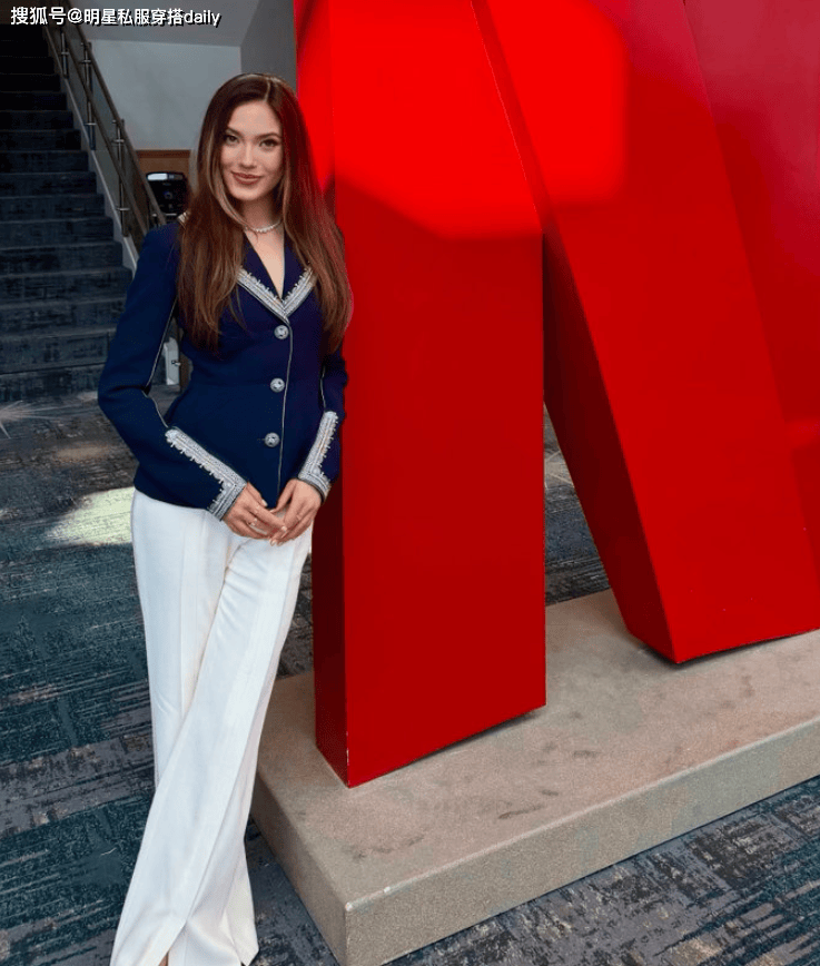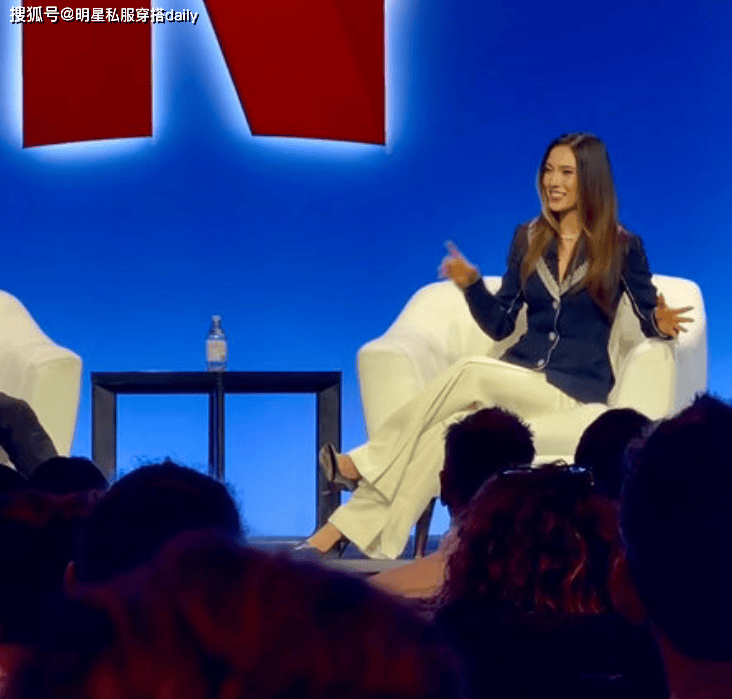 谷爱凌出席奈飞峰会蓝白撞色西装白色直筒裤端庄大气