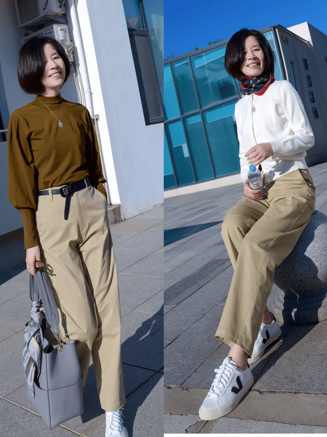 诸如板鞋、球鞋以及德训鞋这些休闲的款式,也是可以与烟管裤组合的,尤其是选择浅色系烟管裤的时候,比如卡其色、浅灰色、米色等等,搭配白色的运动鞋,非常的清爽又不失时髦个性,是大龄女性打造减龄感的必备。