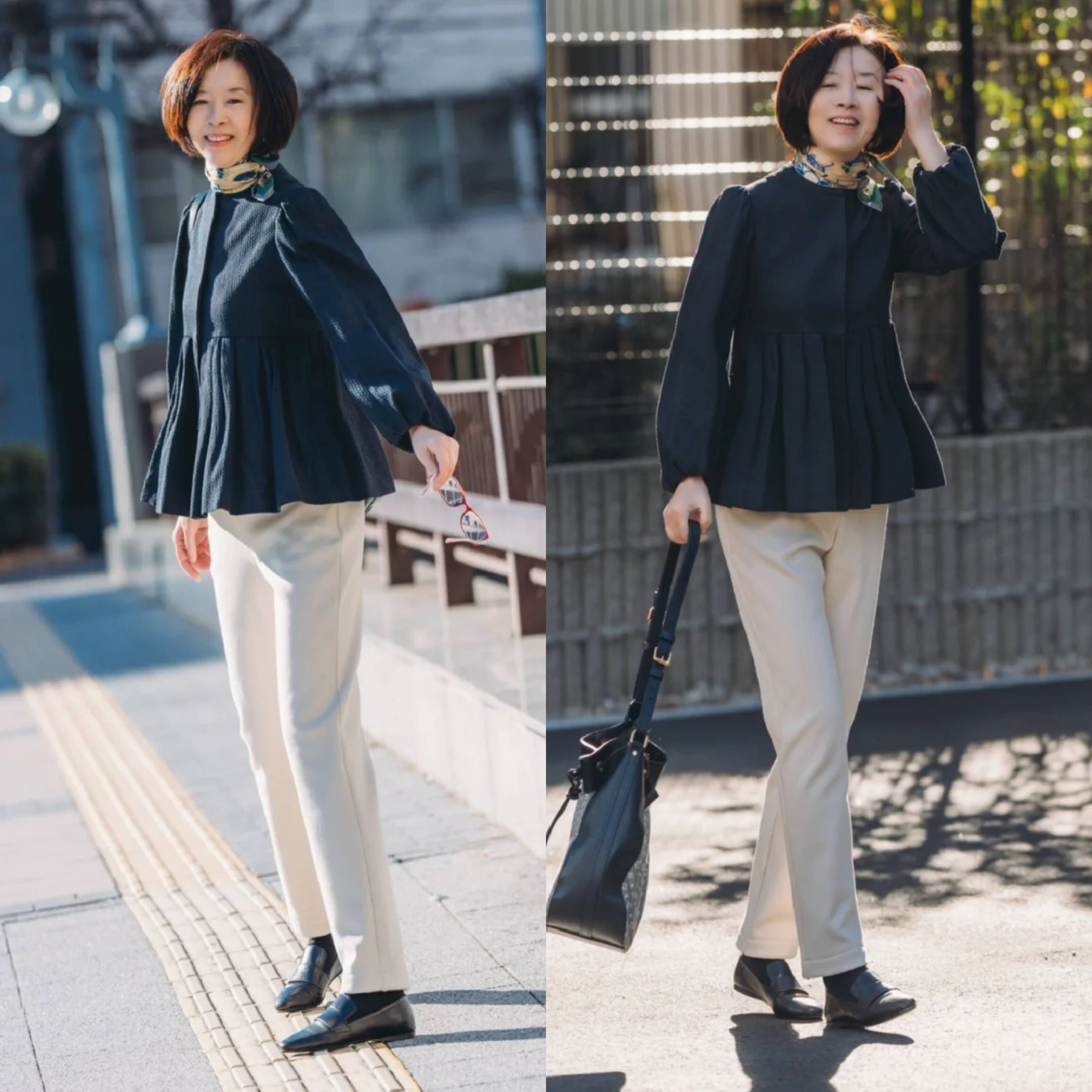 深蓝色娃娃衫上衣搭配米色烟管裤,温柔又减龄,很适合50+女性打造优雅气质。宽松娃娃衫能藏住腰腹赘肉,米色烟管裤利落修饰腿型,中和上衣的慵懒感。再配上一双黑色浅口皮鞋,提亮整体造型,增加精致正式感,整套搭配温柔得体、显瘦显高,日常通勤、出游都很合适。